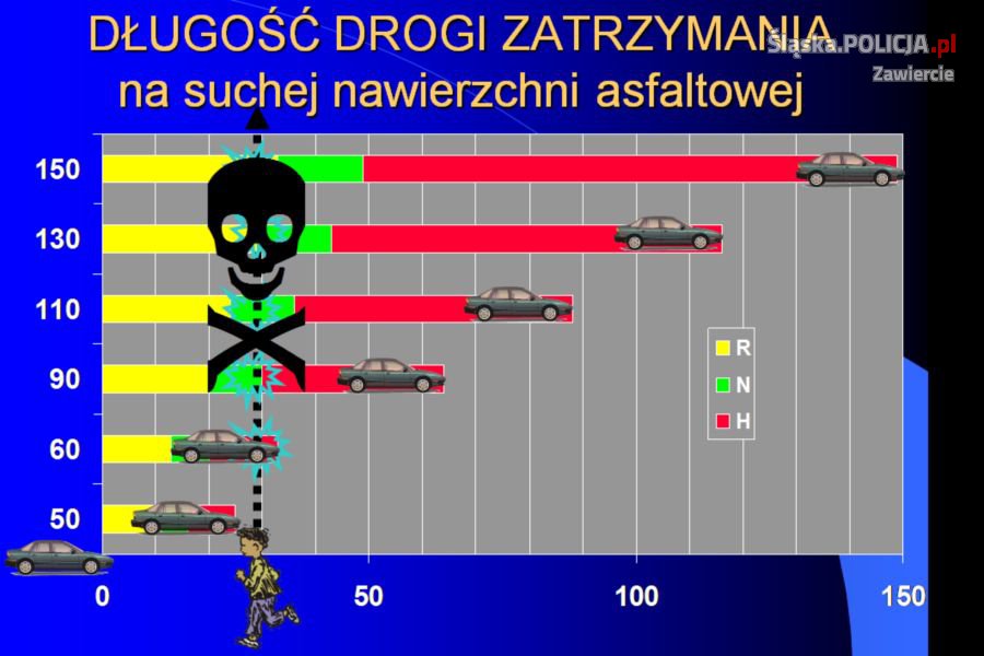 Pamiętajmy też, że minimalna droga zatrzymania samochodu jadącego z prędkością 50 km/h wynosi około 30 metrów, a przy prędkości 100 km/h – 80 metrów. Czym wcześniej kierowca zauważy pieszego na jezdni tym skuteczniej zahamuje czy go ominie.