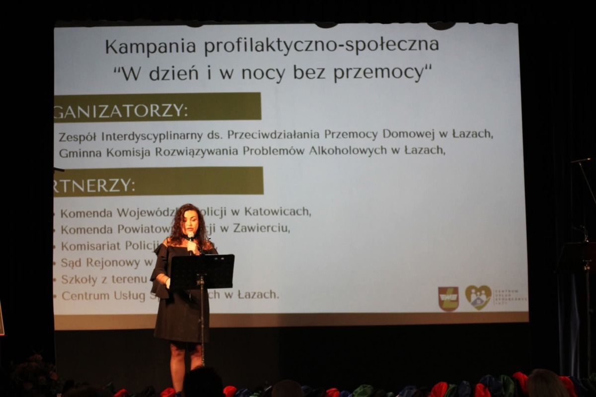 W minioną środę, w Międzynarodowym Dniu Zapobiegania Przemocy Wobec Dzieci, w Miejskim Ośrodku Kultury w Łazach odbył się finał kampanii. Podsumowano podjęte działania oraz akcje, w których uczestniczyli uczniowie. Młodzież wzięła udział w Dniach Otwartych w Sądzie Rejonowym w Zawierciu, odwiedziła Komendę Wojewódzką Policji w Katowicach, a także wzięła udział w konkursach plastycznych i fotograficznych. Finał kampanii uświetnił także występ Orkiestry Komendy Wojewódzkiej Policji w Katowicach, po którym głos zabrali zaproszeni goście, przedstawiciele instytucji publicznych oraz partnerów kampanii. Wśród nich Pierwszy Zastępca Komendanta Powiatowego Policji w Zawierciu podinspektor Paweł Sobota, który podkreślił, jak ważna jest współpraca na rzecz bezpieczeństwa mieszkańców, a szczególnie na rzecz przeciwdziałania przemocy w rodzinie.