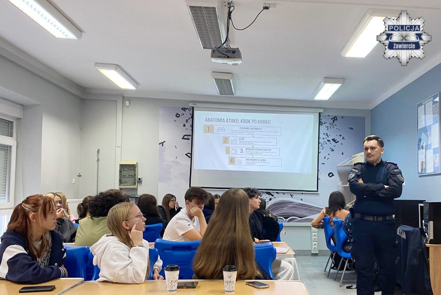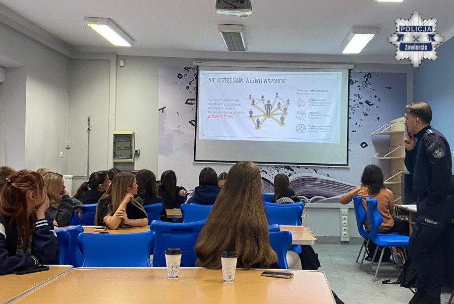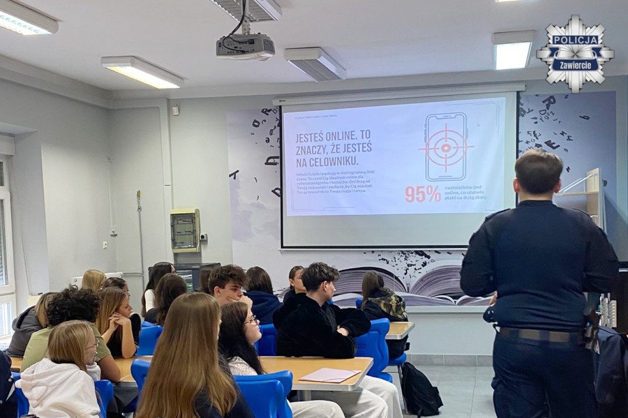 Profilaktyk z zawierciańskiej komendy spotkał się z licealistami, aby porozmawiać o hejcie w sieci. Policjant przytoczył przykłady negatywnych zachowań, ale także wskazał, co należy robić, aby nie paść ofiarą nienawiści. Przypomniał też, gdzie można szukać pomocy. Dodatkowo wskazał inne zagrożenia w cyberprzestrzeni, na które narażone są szczególnie młode osoby.