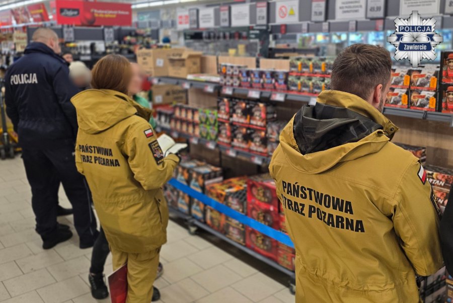 Zawierciańscy dzielnicowi wspólnie z funkcjonariuszami Komendy Powiatowej Państwowej Straży Pożarnej w Zawierciu kontrolowali miejsca sprzedaży fajerwerków. Sprawdzali legalność pochodzenia materiałów pirotechnicznych, a także posiadanie instrukcji obsługi w języku polskim. Kolejną rzeczą, na którą zwracali uwagę były warunki przechowywania fajerwerków oraz wyposażenie stoiska w środki gaśnicze i tabliczki informacyjne. Strażacy weryfikowali również, czy sprzedawcy wiedzą co robić, w sytuacji pojawienia się ognia. Wczorajsze kontrole nie wykazały nieprawidłowości.