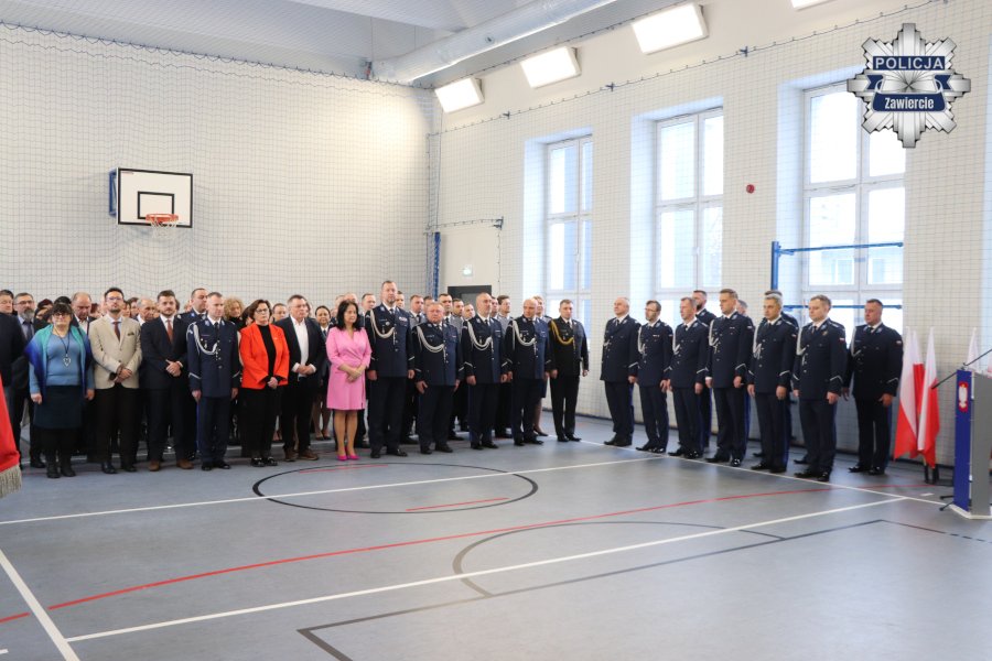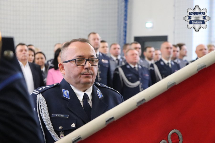 Po odczytaniu przez komisarza Marka Jona z Wydziału Gabinet Komendanta Wojewódzkiego Policji w Katowicach rozkazów personalnych nastąpiła ceremonia pożegnania i powitania ze sztandarem zawierciańskiej jednostki.