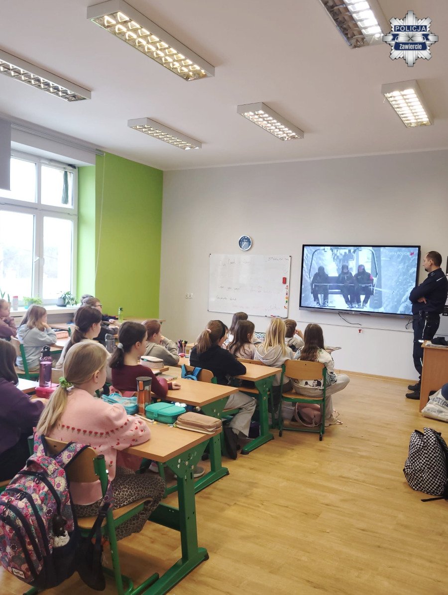 Aspirant Szymański mówił także o bezpieczeństwie podczas wyjazdów na odpoczynek w górskie rejony. Wskazał, jak należy poruszać się po drogach, przy których nie ma chodnika. Podkreślił też, jak ważne jest bycie widocznym na drodze, zachęcając młodzież do noszenia odblasków.