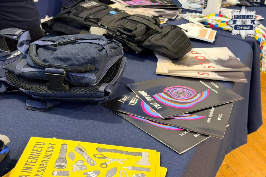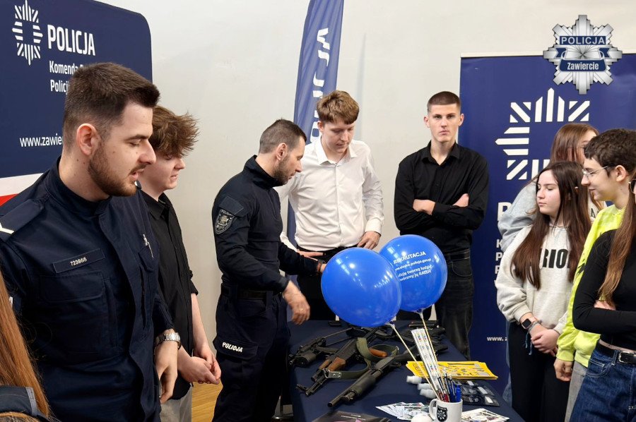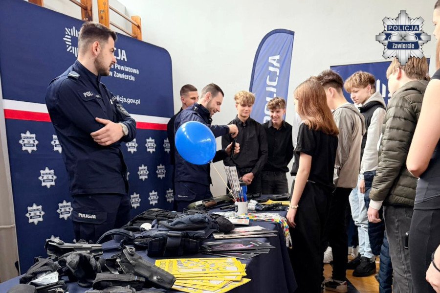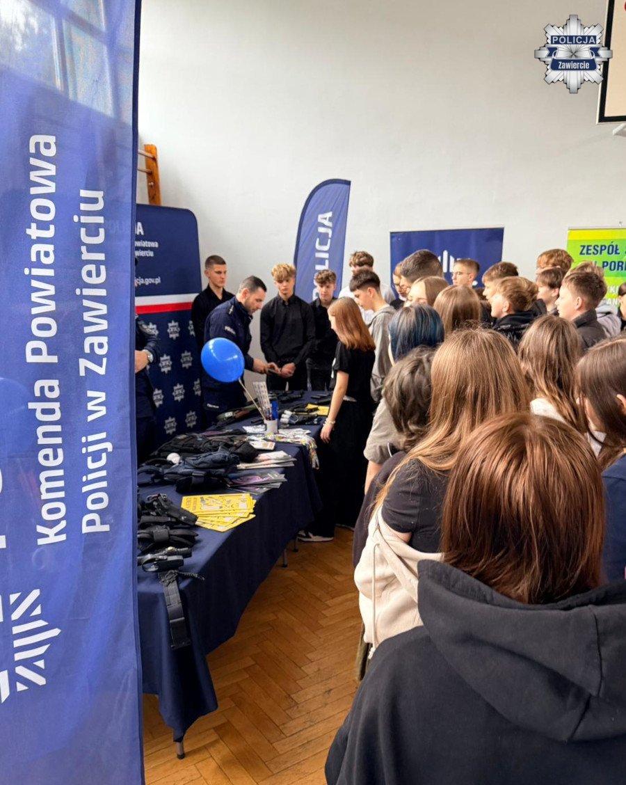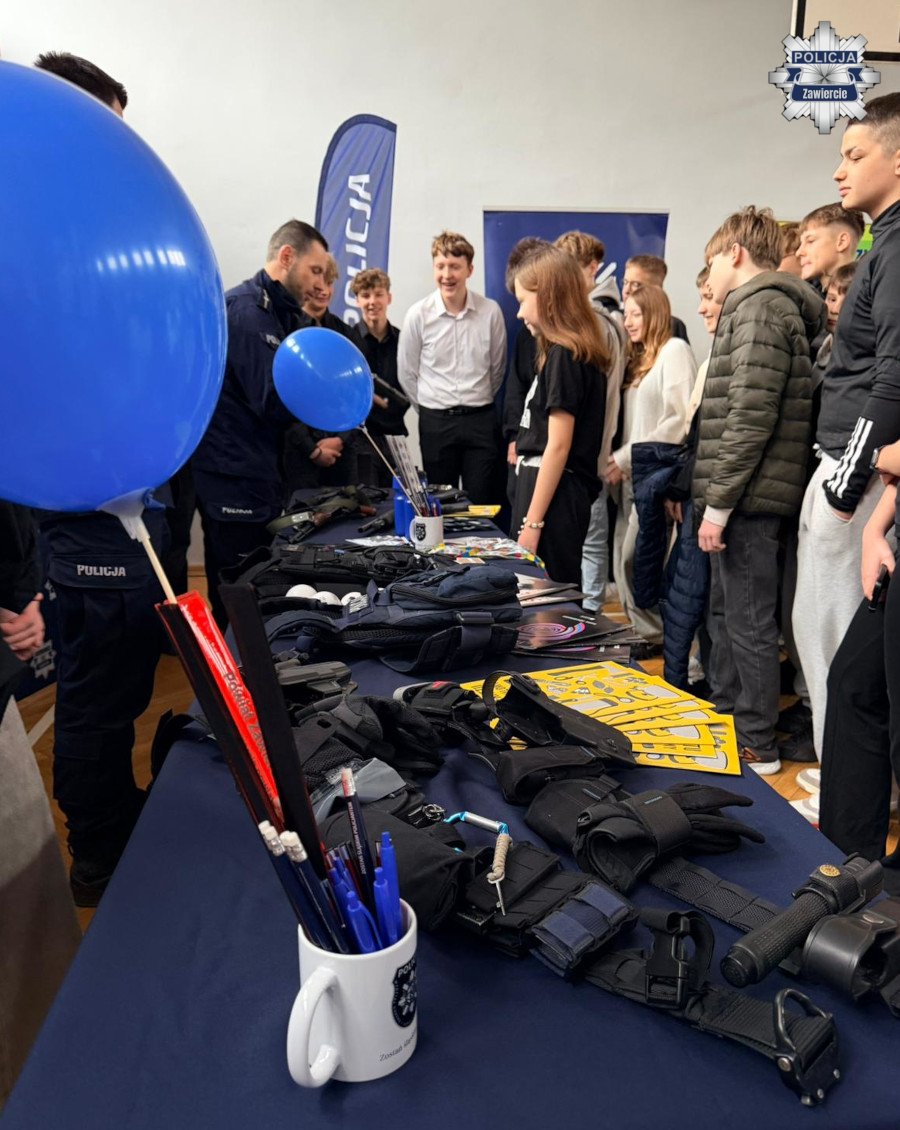 Podczas dnia otwartego, profilaktycy oraz policjant z zespołu kadr i szkolenia zawierciańskiej komendy przygotowali stoisko, na którym zaprezentowali sprzęt wykorzystywany w codziennej służbie. Uczniowie mogli z bliska przyjrzeć się policyjnemu wyposażeniu, a także dowiedzieć się, jak wygląda praca mundurowych w praktyce.