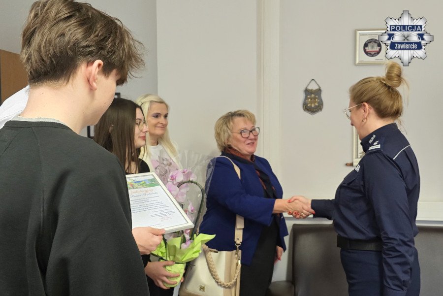 Wczoraj zawierciańskich policjantów odwiedzili przedstawiciele Zespołu Szkół w Porębie, na czele z panią dyrektor Elżbietą Horbatowską. Głównym celem wizyty było spotkanie z Komendantem Powiatowym Policji w Zawierciu mł. insp. Renatą Hałabudą i złożenie gratulacji z okazji objęcia na początku tego roku zajmowanego stanowiska. Była to również doskonała okazja do rozmowy na temat działalności klasy mundurowej, a także na przybliżenie specyfiki policyjnej służby.